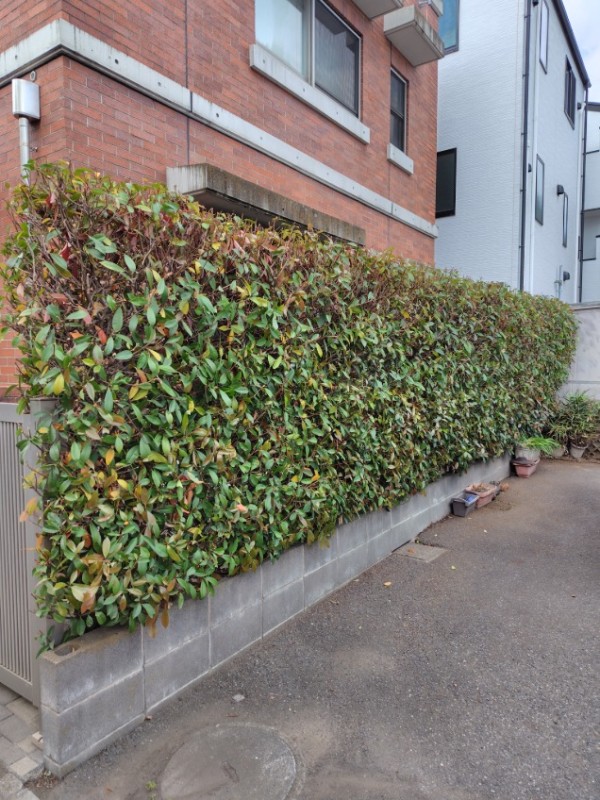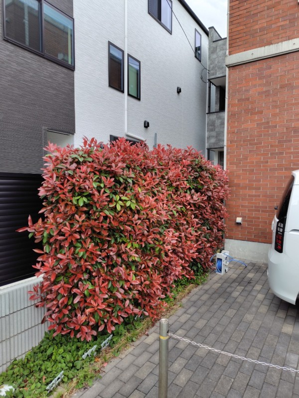 レッドロビンの生垣の剪定のご依頼をいただきました。内容的には駐車場の生垣とお庭の生垣の2カ所と駐車場の草刈りのご依頼でした。今迄はご自分達で剪定をしていたとの事でしたが、今回はかなり枝が伸び放題になってしまい、手に負えなくなってしまったとの事でのご依頼でした。オーナー様のご要望に沿って作業をさせていただき、作業終了後、施工内容をご確認いただき、ご希望りの仕上がりに充分ご満足していただきました。